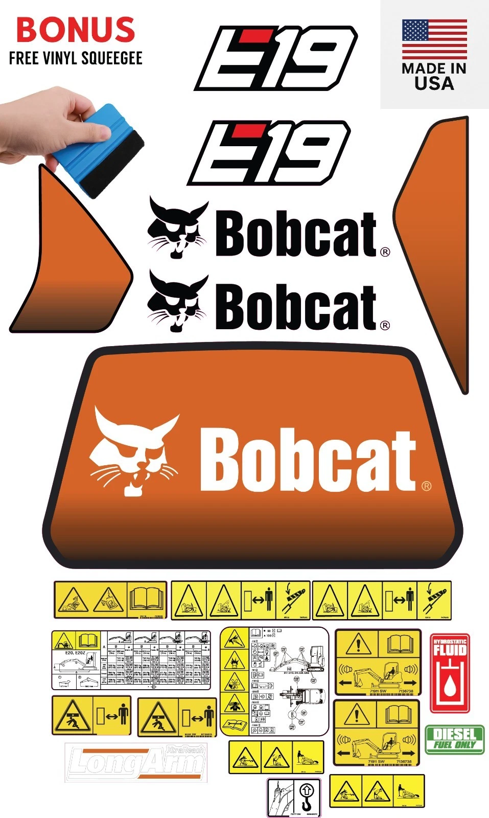 This decal kit is designed to fit Bobcat E19 Mini Excavator machinery. Please verify your equipment model before purchasing to ensure proper fitment. If you are unsure whether this decal kit is compatible with your machine, feel free to contact our support team before placing your order.