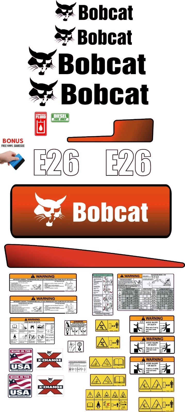 This decal kit is designed to fit Bobcat E26 Mini Excavator machinery.