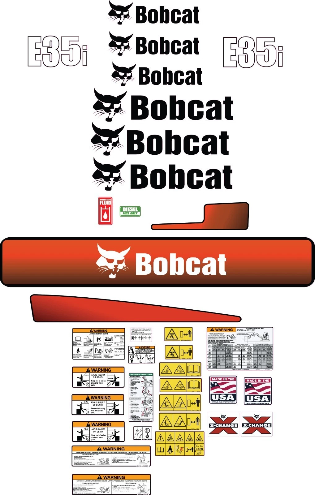 This aftermarket replacement decal kit is designed to fit Bobcat E35i Mini Excavator equipment and is manufactured to meet high-quality standards for durability, clarity, and long-term performance. It is ideal for restoring the original appearance of your machine or replacing worn, damaged, or missing safety and identification decals.