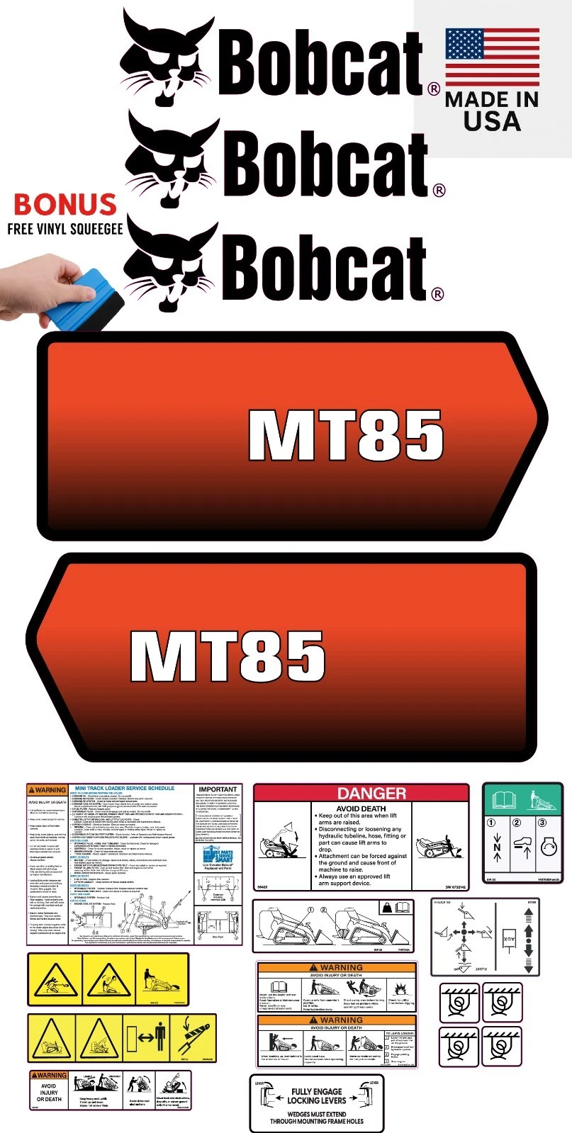This decal kit is designed to fit Bobcat MT85 Mini Skid Steer machinery.