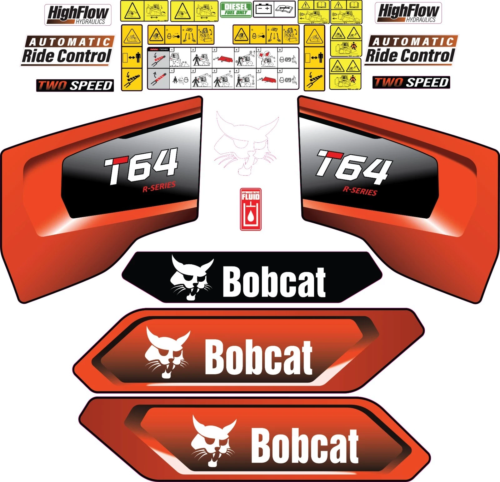 This decal kit is designed to fit Bobcat T64 Skid Steer machinery. Please verify your equipment model before purchasing to ensure proper fitment. If you are unsure whether this decal kit is compatible with your machine, feel free to contact our support team before placing your order.