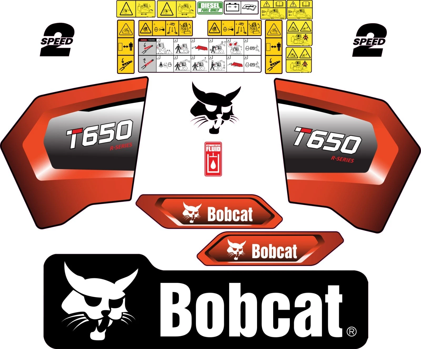 This decal kit is designed to fit Bobcat T650 Skid Steer machinery.