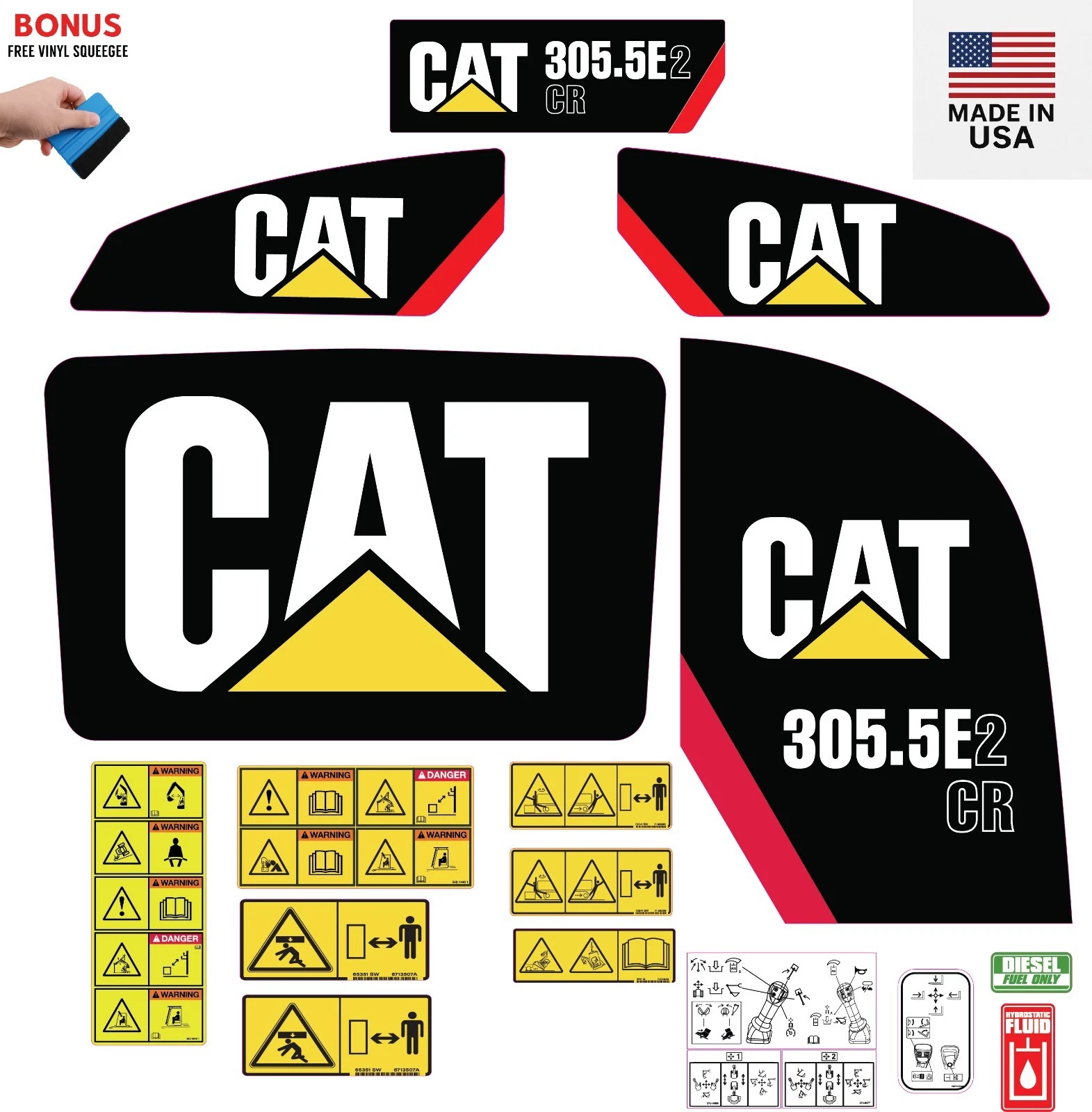 This decal kit is designed to fit Caterpillar 305.5E2 CR Mini Excavator machinery. Please verify your equipment model before purchasing to ensure proper fitment. If you are unsure whether this decal kit is compatible with your machine, feel free to contact our support team before placing your order.