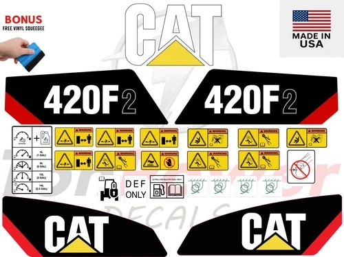 This decal kit is designed to fit Caterpillar 420F2 Backhoe Loader machinery. Please verify your equipment model before purchasing to ensure proper fitment. If you are unsure whether this decal kit is compatible with your machine, feel free to contact our support team before placing your order.