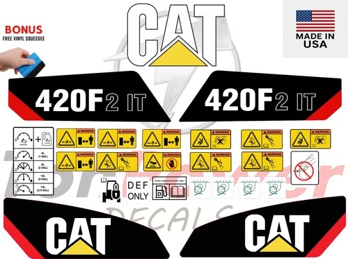 This aftermarket replacement decal kit is designed to fit Caterpillar 420F2 IT BACKHOE Loader equipment and is manufactured to meet high-quality standards for durability, clarity, and long-term performance. It is ideal for restoring the original appearance of your machine or replacing worn, damaged, or missing safety and identification decals.