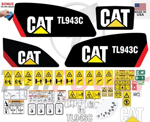 This aftermarket Caterpillar telescopic forklift sticker and decal kit is designed to fit Caterpillar TL943C Telescopic forklift equipment and is manufactured to meet high-quality standards for durability, clarity, and long-term performance. These aftermarket Caterpillar stickers and decals are ideal for replacing worn, damaged, or missing safety, warning, and identification decals commonly found on telescopic forklifts operating in demanding jobsite conditions.