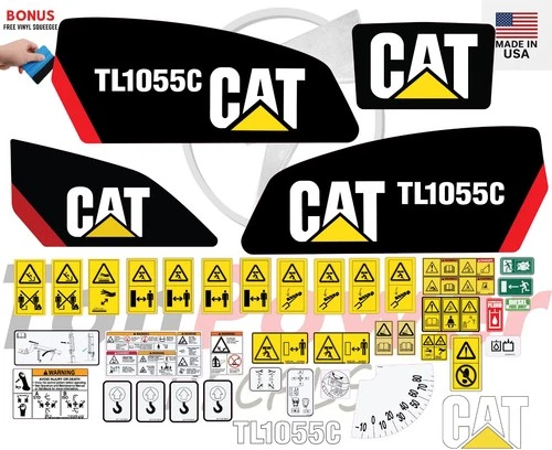 This decal kit is designed to fit Caterpillar TL1055C Telescopic forklift machinery. Please verify your equipment model before purchasing to ensure proper fitment. If you are unsure whether this decal kit is compatible with your machine, feel free to contact our support team before placing your order.