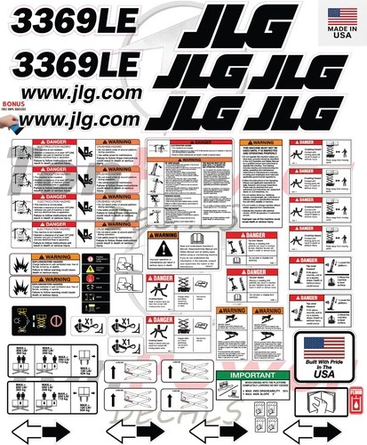 This aftermarket JLG scissor lift sticker and decal kit is designed to fit JLG 3369LE scissor lift equipment and is manufactured to meet high-quality standards for durability, clarity, and long-term performance. These aftermarket JLG stickers and decals are ideal for replacing worn, damaged, or missing safety, warning, and identification decals commonly exposed to harsh jobsite conditions in lifting and access operations.