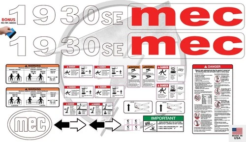 Upgrade and enhance the look of your equipment with this aftermarket sticker and decal kit for MEC 1930-SE Scissor Lift, designed to fit MEC Scissor Lift machines and provide a high-quality replacement solution for worn, damaged, or faded graphics. These aftermarket MEC 1930-SE Scissor Lift decals help restore your machine while keeping safety and identification labels clear and visible.