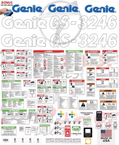 This decal kit is designed to fit Genie GS-3246Scissor Lift machinery. Please verify your equipment model before purchasing to ensure proper fitment. If you are unsure whether this decal kit is compatible with your machine, feel free to contact our support team before placing your order.