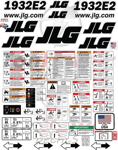 This aftermarket JLG scissor lift sticker and decal kit is designed to fit JLG 1932E2 scissor lift equipment and is manufactured to meet high-quality standards for durability, clarity, and long-term performance. These aftermarket JLG stickers and decals are ideal for replacing worn, damaged, or missing safety, warning, and identification decals commonly exposed to harsh jobsite conditions in lifting and access operations.