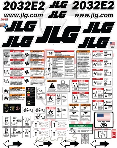 This aftermarket JLG scissor lift sticker and decal kit is designed to fit JLG 2032E2 scissor lift equipment and is manufactured to meet high-quality standards for durability, clarity, and long-term performance. These aftermarket JLG stickers and decals are ideal for replacing worn, damaged, or missing safety, warning, and identification decals commonly exposed to harsh jobsite conditions in lifting and access operations.