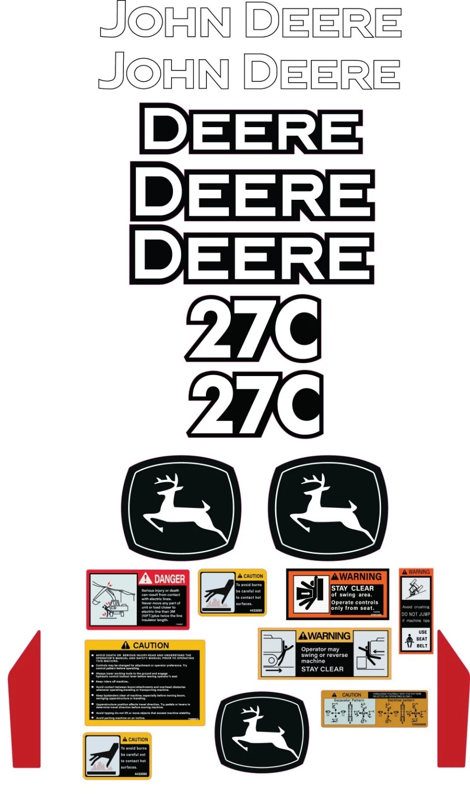 This aftermarket replacement decal kit is designed to fit JOHN DEERE 27C Mini Excavator equipment and is manufactured to meet high-quality standards for durability, clarity, and long-term performance. It is ideal for restoring the original appearance of your machine or replacing worn, damaged, or missing safety and identification decals.