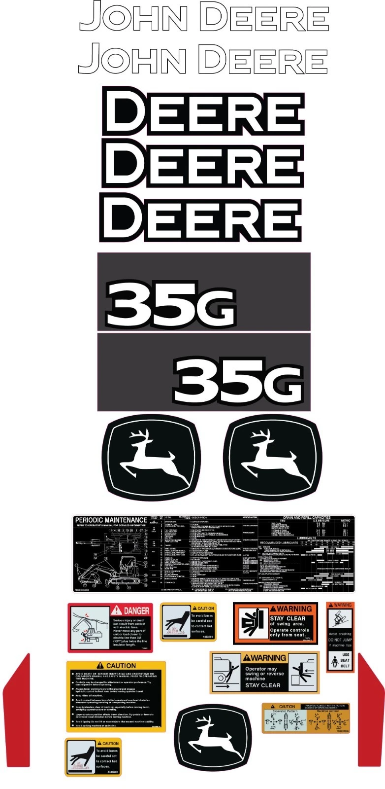 This decal kit is designed to fit JOHN DEERE 35G Mini Excavator machinery.