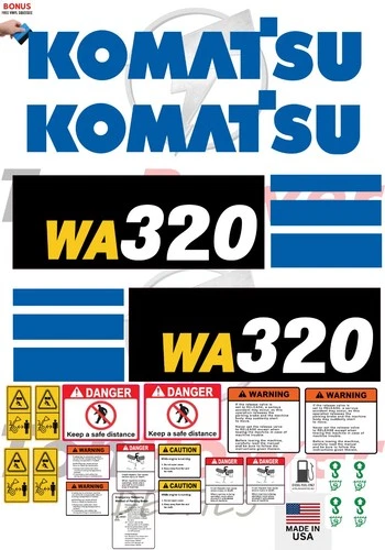 This aftermarket Komatsu wheel loader sticker and decal kit is designed to fit Komatsu WA320-8 wheel loader equipment and is manufactured to meet high-quality standards for durability, clarity, and long-term performance. These aftermarket Komatsu stickers and decals are ideal for replacing worn, damaged, or missing safety, warning, and identification decals commonly exposed to harsh jobsite conditions in loading and material handling operations.