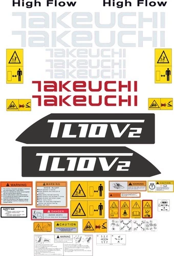This decal kit is designed to fit Takeuchi TL10V2 Skid Steer machinery.